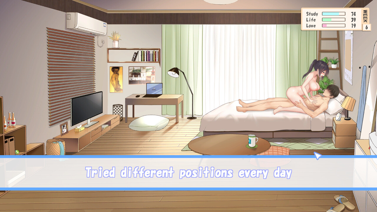 The protagonist begins cohabiting with his girlfriend, Kanako Tsukishima, whom he started dating in college. Compared to their sweet romance, living together presents many practical challenges. Players must plan their daily lives, balancing academics, lifestyle, and romance. Fulfilling Kanako’s physical and emotional needs is also crucial as her boyfriend. Too much intimacy may lead to her dislike, while a lack of it is, of course, unacceptable. The 26 weeks the protagonist and Kanako spend together will determine their fate (ending). This game features an auto-save system. To enhance realism, the player’s past actions are recorded, and conversations with Kanako and her reactions will vary. Failing to properly listen to her may result in being dumped.