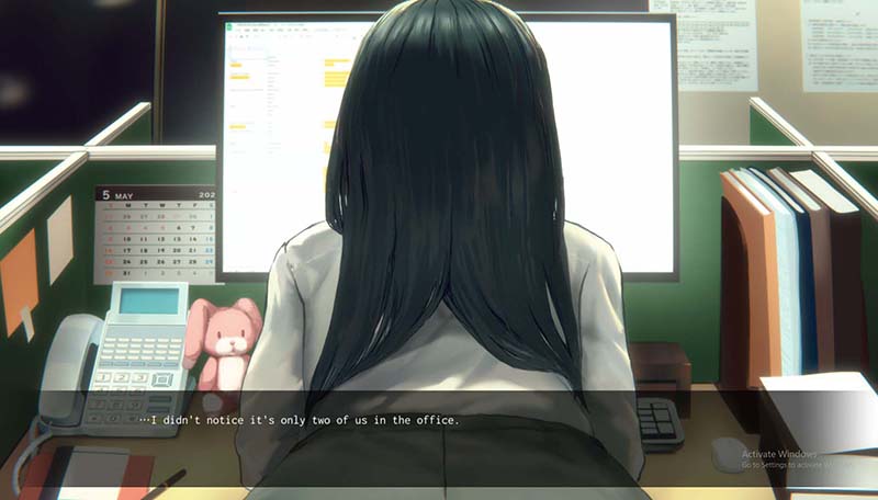Our protagonist is finishing up some late-night overtime at the office, and finds himself alone with a female colleague.